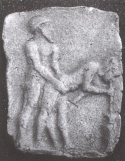 It may be that sacred prostitution was also the issue in I Corinthians 6:9 where Paul the Apostle listed arsenokoitai and malakoi among those who would not inherit the kingdom of God. These words are hard to translate. Malakoi refers to “soft ones” or “effeminates,” who could be young men who took the submissive position in male-on-male sex. Arsenokoitai is a neo-logism or a made up word which may be Paul’s attempt to render in Greek the Hebrew word in Leviticus for male-on-male sex. Presumably these are men who take the dominant position in sex. These words may refer to pornoeia or prostitution, but they definitely cannot refer to homosexuality in general as some English translations have rendered the two terms. Paul goes on in I Cor. 6:15–16 to refer to joining your body to a prostitute. Corinth was the site of the Temple of Aphrodite, which had prostitutes in service to the goddess. It was also a port city with ordinary male and female prostitutes who plied their trade among seafaring customers. Once again, then, prostitution was involved along with the “fornicators, idolaters, and adulterers” as well as men seeking sex with the soft ones. Below a man is bargaining with a prostitute on a Greek urn.